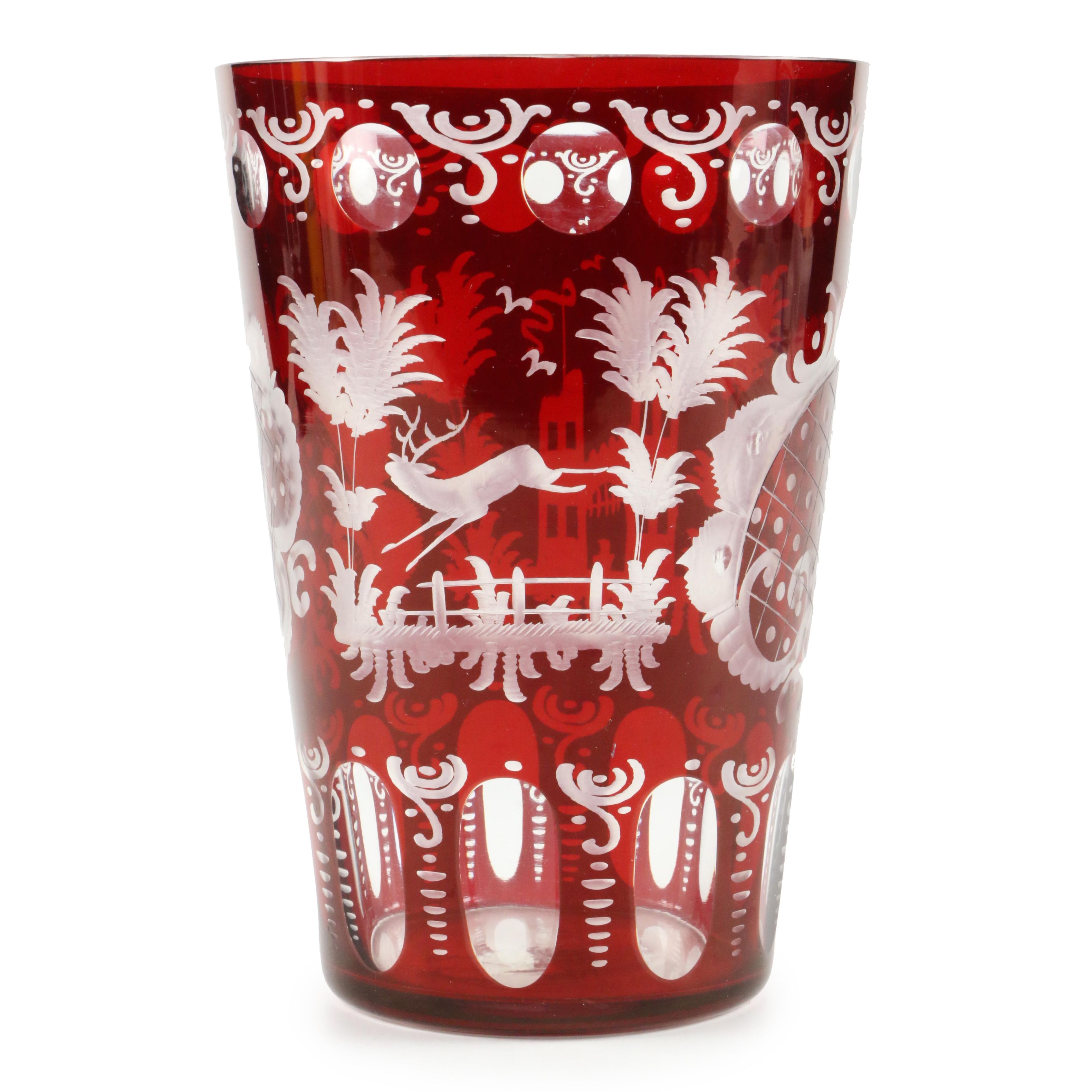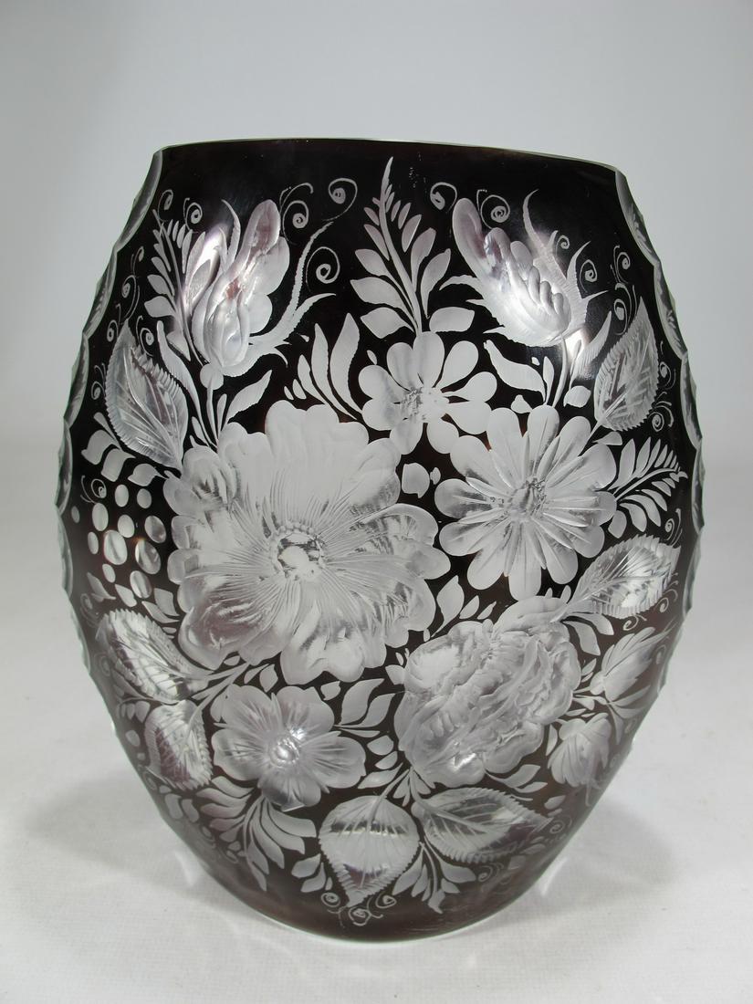 Uncategorized Ruby Cut Glass Vase : $225.00 usd from via maris nyc. The cut design is floral in center of vase with arced wreath like designs at top and bottom edges.